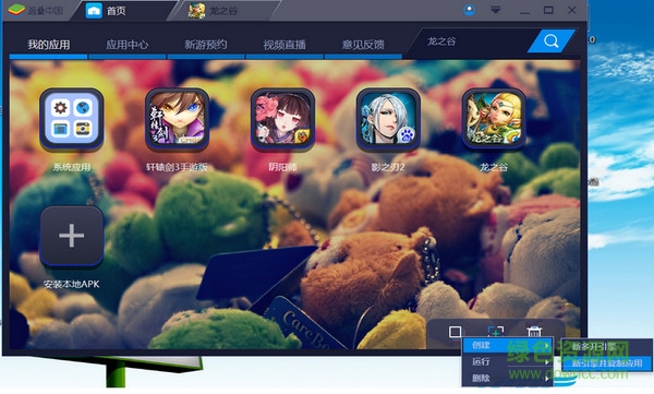 1、启动BlueStacks蓝叠模拟器后,在首页右下角有一多开图标,点击后选择创建,一般来说选择“新引擎并复制应用”,因为选择“新多开引擎”只是复制模拟器,而“新引擎并复制应用”在复制模拟器的同时,把应用也复制并安装完毕,而我们最终是希望同时多开几个游戏,所以建议大家在首页安装好游戏后,选择“新引擎并复制应用”。