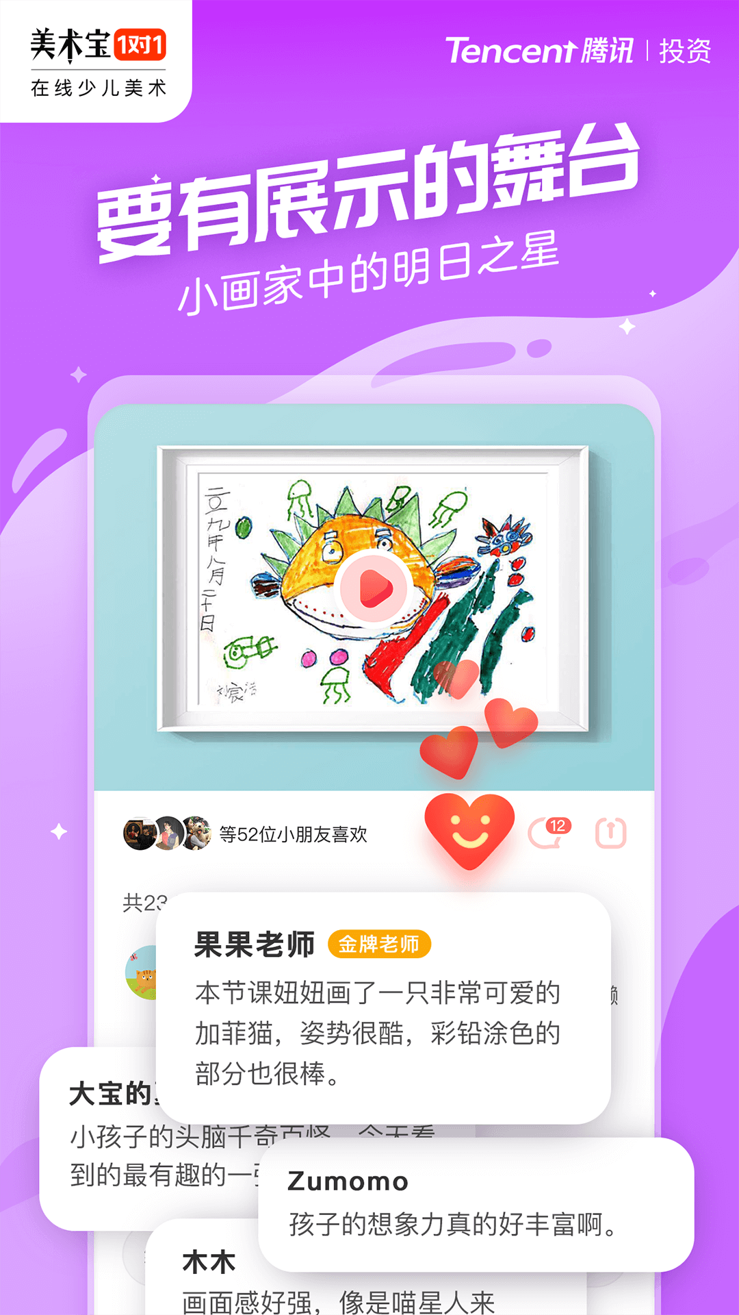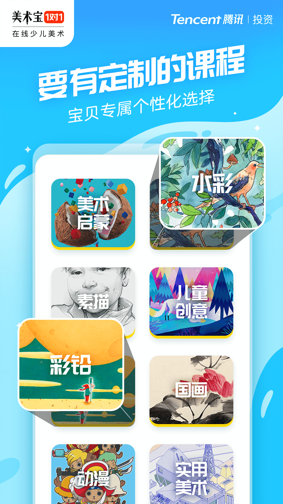 美术宝1对1-儿童少儿学画画 预约名师陪你练。美术宝1对1通过1对1在线视频的方式,让孩子在家就能学画画,帮助孩子有效学习和掌握画画能力和技巧,提升孩子的对事物的审美和美术的应用。美术宝1对1通过线上一对一线上陪画教画的方式解决孩子课堂上老师照顾不到的问题、无人指导等一系列学画问题;课程结束后会有上课评价但反馈给班主任老师,班主任老师会根据学生学习情况,并优化教学方案。美术宝1对1致力于美术教育+互联网的探索,为美术爱好者解决在绘画的过程中烦恼,为家长和老师提供更便捷的教育方案,推进美术教育的发展。美术宝1对1借助于美院师资、游戏性教学体验,让小朋友在家就可以快乐,高效的提升绘画水平,从小就能向美院的老师看齐。