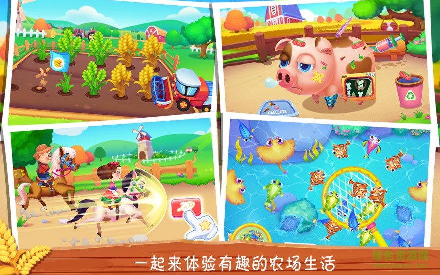 打开游戏,进入地图,呈现在眼前的是一大片绿油油的农场。先去池塘看看吧~点击池塘,好多好多鱼儿等着你来捕获呢,冰冻鱼、彩虹鱼、放大鱼等各种各样奇异的鱼儿——抓住彩虹鱼可以出现更多的鱼,抓住放大鱼你的鱼网会变大,放过冰冻鱼吧,它们冻住你的渔网哦!领略过好玩又刺激的农场捕鱼,再来车库看看这个拖拉机吧。哈,这拖拉机还有个名字,叫老弗雷德。老弗雷德需要你用独特的眼光将他打扮得漂漂亮亮。从右侧选项栏里选择不同风格的顶棚与配件将其改装,再给车身喷上漂亮的颜色,装上与众不同的轮胎,再配上一个装饰物。嗯~果然是人靠衣装,拖拉机也要靠打扮呢!忙活了半天,到赛马场参加一场赛马比赛吧。你需要不停点击屏幕右侧的按钮让马儿跑起来,当然若是出现了加速按钮,可千万别忘记按下哦!无论比赛输赢,骑在马背上驰骋的感觉真是太爽了,这个农场主做起来真是太有趣啦!
