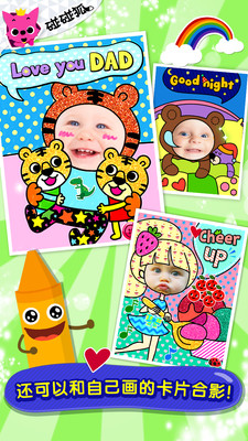 ‘我爱你!’、‘祝你生日快乐!’等主题相框,让孩子选择喜欢的相框拍照并进行装饰,然后把漂亮的卡片送给家人和朋友!
