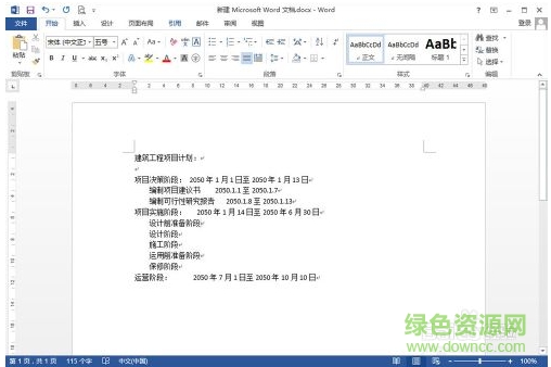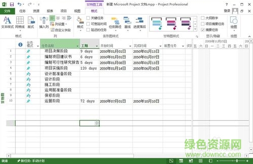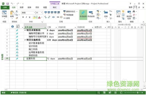 8、上面只是简单的制作一个计划的project文件,实际计划内容不只是这么简单,还包括了各种人力、物力资源设置、各任务的前后顺序等逻辑关系;