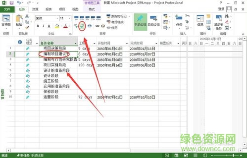 5、有些任务是某个阶段下的子任务,需要要project调整一下级别,即阶级,选择要阶级的任务,如编制项目建议书,然后点击任务功能区中的降级任务按钮;