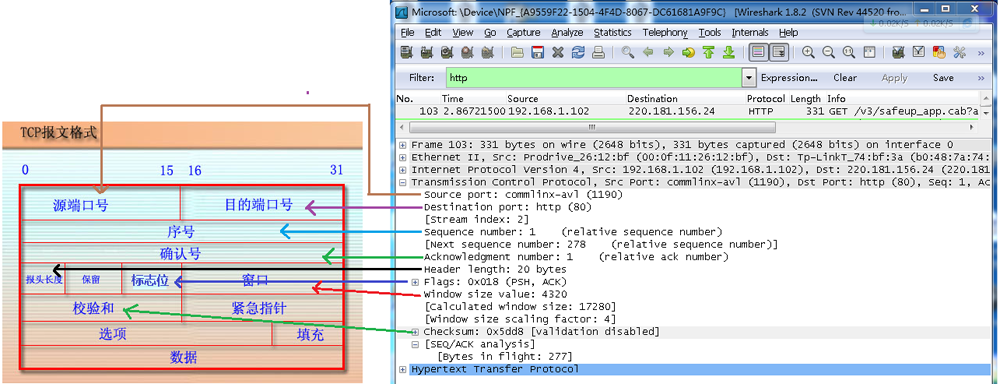 从下图可以看到wireshark捕获到的TCP包中的每个字段。