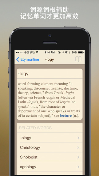 可以看到术业有专攻,培根词汇作为一个词源词典,比欧陆词典的结果显然专业多了,而对比网页版的Etymonline,培根词典明显更能担当重任。值得一提的是培根词汇的「Related Words」。One More Thing… 我们开发出了Related Words这一划时代的功能,将所有同根、同源词汇进行了链接。现在这个App里能查询包含同一词根词源的所有单词。如:查询表示词根-logy时,不仅能方便的查看同源词Lecture,同时还能利用“Related Words”功能查看Agriology, Anthropology, Biology, Cardiology, Choreology, Christology, Chronology, Cosmology等近百个包含-logy词根的同根词。这是一个激动人心的功能,一旦拥有,别无所求。