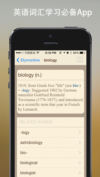 世界上最好的英语词源词典,英文版的《说文解字》。这是一本与众不同的英英词典,对英语词汇进行百科全书式的梳理,告诉你英语单词每个意思的来源、历史年代。通过讲述单词背后的故事来帮助你梳理词与词的关系,形成词汇网络,在理解的基础上形成牢固记忆,这才是高效记单词最轻松、最符合逻辑的方法。每一个想提高自己英语水平的人都应该拥这个词典 app,背单词的最佳伴侣。