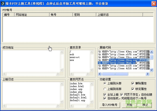 5.绿卡FTP全自动挂机版2000超强线程,24小时稳定挂机扫描,自动更换关联词,目前网络上最快的软件,不死线程,电脑或服务器挂机最佳选择