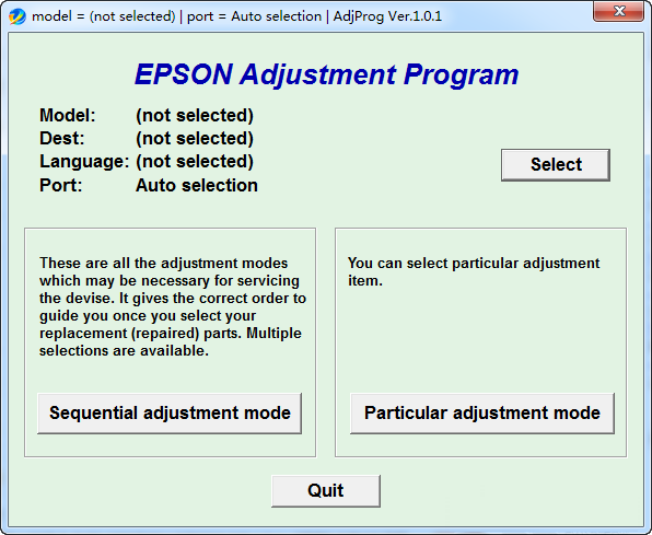 连接打印机,打开软件,软件会自动检测打印机设备,sequential adjustment mode是顺序调整模式,particular adjustment mode是特别调整模式。点击之后会弹出相应的窗口,选择打印机设备的名称,端口就可以进行下一步清零操作。进入界面选择 Clearing the Portection counter 进行清零操作。