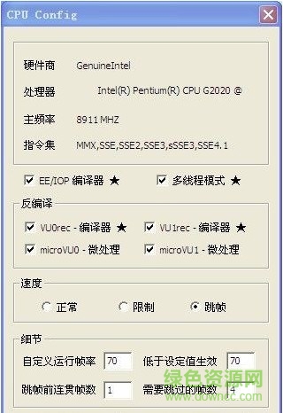 这个是CPU配置,CPU是3或4核心的可以把跳帧变成限制,CPU是双核的必须跳帧,否则速度极慢,CPU是1核心的基本玩不起,自定义运行帧率,低于设定值生效果那个,两个,不要高于75,否则的话速度会很快,难以控制。
