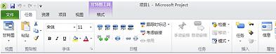 当您首先启动 Project 2010 时,您可能会对您所看到的内容感到惊奇。菜单和工具栏已替换为功能区,功能区可帮助您快速找到完成任务所需的命令。命令按逻辑组进行组织,逻辑组集中在选项卡下。