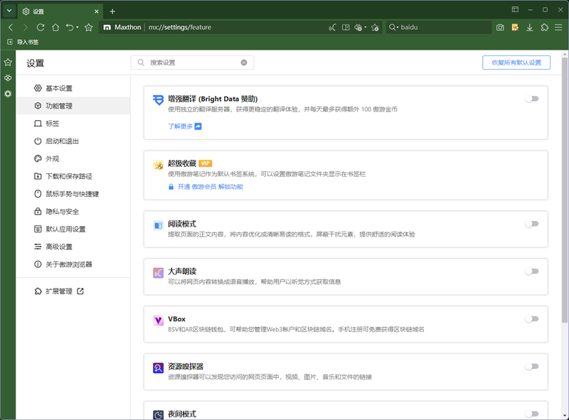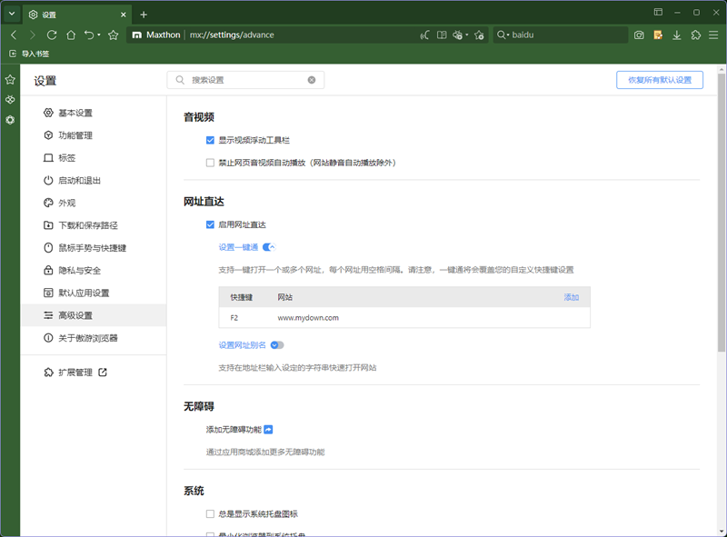 内置的傲游智能加速功能可以帮助提高日常浏览和前进、后退时的速度。通过状态栏图标开启的超级加速功能更可以大大提高部分网站的浏览速度。