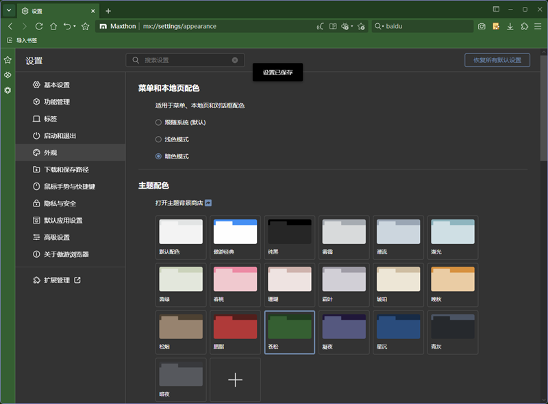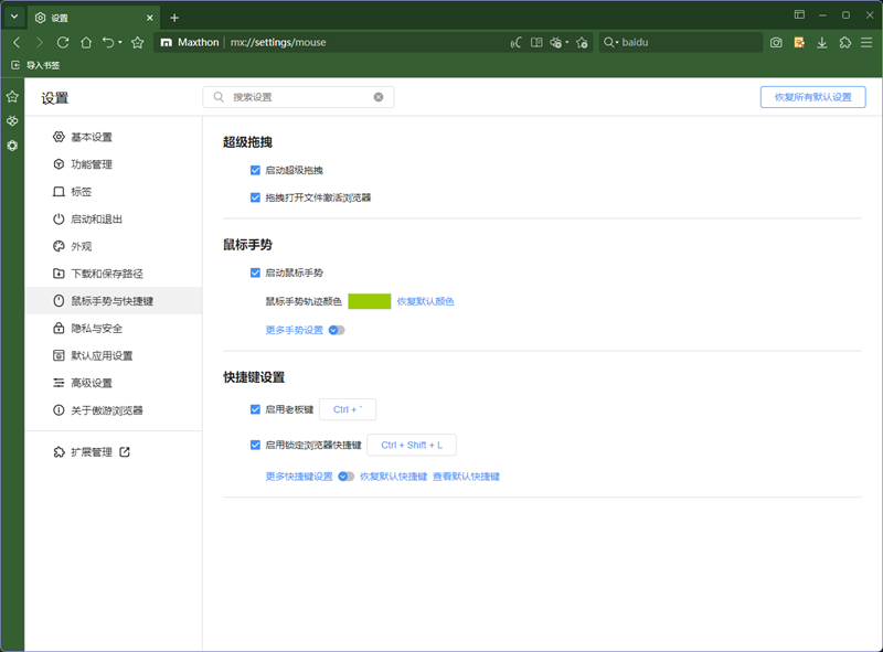 按住鼠标右键比划一下就可以执行如关闭、前进、后退等常用的操作,大大提高了鼠标利用率。用户还可以在设置中心里面修改和添加其他用户想要的动作。