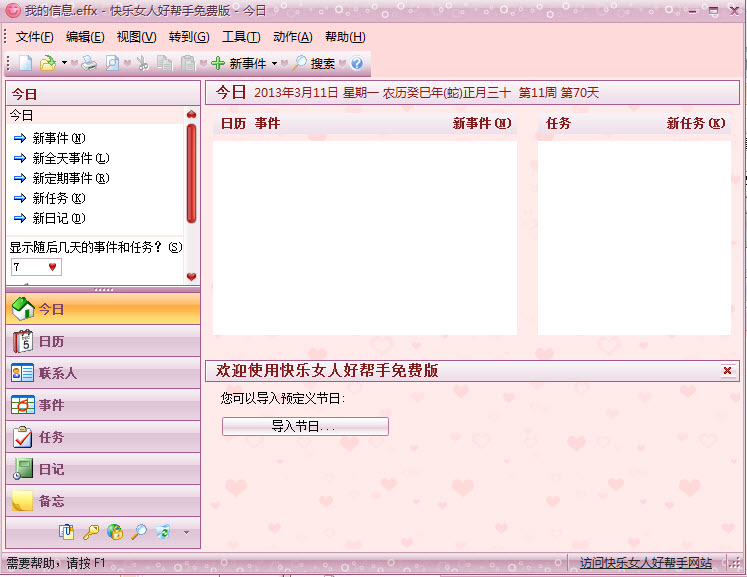 快乐女人好帮手全球第一款专为女士设计的时间和联系人管理软件!时尚靓丽的软件界面,才能满足快乐女人的要求!软件有良好的便携性,绿色版本可以直接放到u盘运行;密码保护、自动备份等多种措施保证您数据的安全;类似baidu的一键搜索,便于您快速查找自己的海量个人信息;集成类似word的文字处理器,您可以随时书写日记、备忘和备注。一套程序即集成了通讯录、公历农历、日程安排、工作任务管理、日记本、备忘录、桌面便笺、密码管理器等诸多功能。另外,软件同时提供官方发布的免费体验版本,满足不同朋友们的需求。女人的一天,从打开“快乐女人好帮手”程序开始!