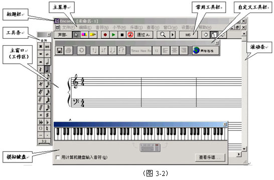 打开Encore软件,会先出现Encore的标志(图3-1),紧接着就进入Encore软件的主界面,默认的乐谱格式是钢琴大谱表(图3-2)。