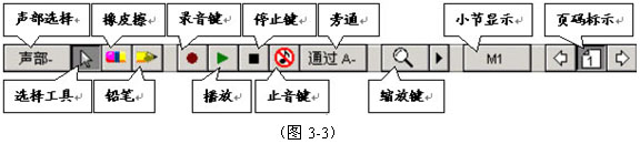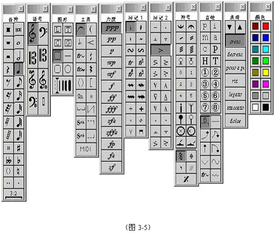 工具条共有11条,包括音符、谱号、图形、工具、力度、标记1、标记2、符号、吉他、表情、颜色等绘谱所需要的工具。他们可以在工作过程中根据需要打开、关闭和移动。如果这个工具条看不见了,可在“窗口菜单”的“工具条”中点击“音符” 工具条(或其他工具条),重新打开他。