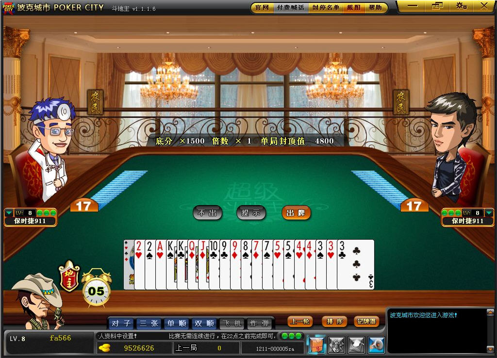 波克城市游戏大厅里的斗地主游戏目前是国内最流行的一款牌类游戏,可分为一副牌,两幅牌。这种玩法的介绍,这里就不多做详述,网站的游戏介绍里可以查看。”人性化的设计”是我们对这款游戏的突破之处,Q版的人物形象、背景语音的设计,游戏中的记牌器,拍照功能和对游戏中各种牌型的理解来设计出诙谐的场景效果,无非就是要博您一笑。在操作上,也加入提示建功能,最大程度上优化了玩家点击出牌时繁文缛节。波克城市的理解: ”不浪费玩家的时间,才是对玩家最大尊重!”