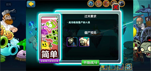 2、接着我们在通关要求中可以提前进行僵尸预览,看看接下来入侵的僵尸是什么类型,看完后,点击【开始战斗】即可开始游戏;