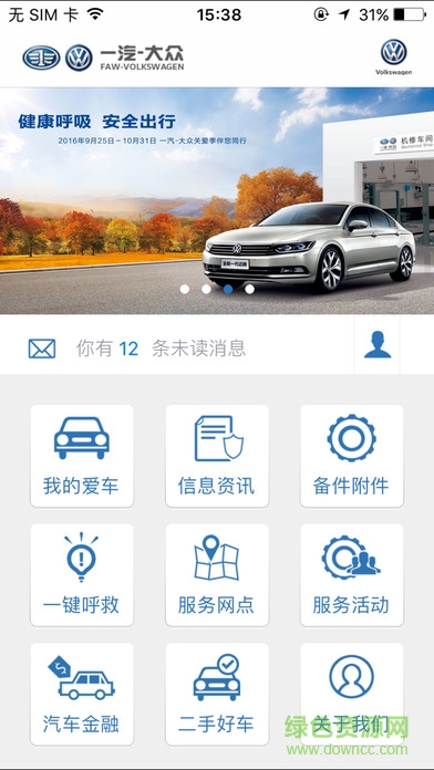 一汽大众服务是大众为车主推出的一款汽车售后服务手机软件,支持在线查看自己的爱车情况,支持进行一键呼救和网点的查询,还可以进行二手车交易和汽车理财,欢迎有需要的朋友到绿色资源网下载使用!