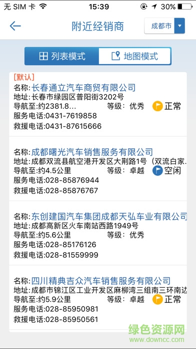 4.【服务网点】:在这里,有最全的经销商位置与服务电话,自动获取客户地理位置,提供附近经销商最详细的信息,名称、地址、距离、等级、服务电话、救援电话、空闲状态。