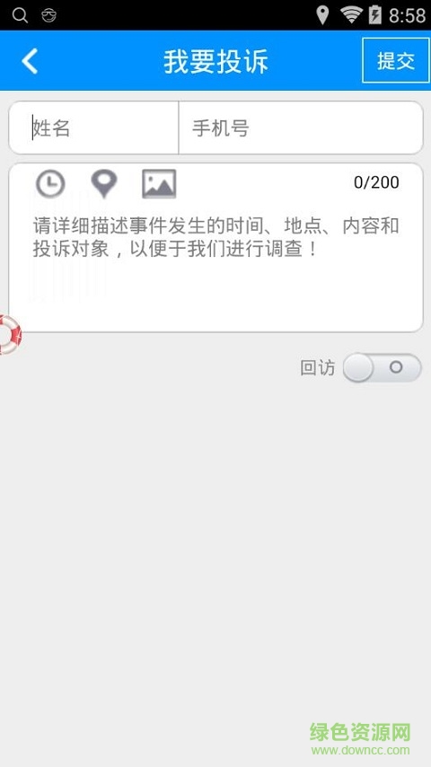 6.“我要投诉”、“我要咨询”,应填写问题描述,描述信息不多于200个汉字;快捷选择或手动填写的时间、地点;增加现场照片,用户需至少上传一张问题相关的图片,点击提交即可。
