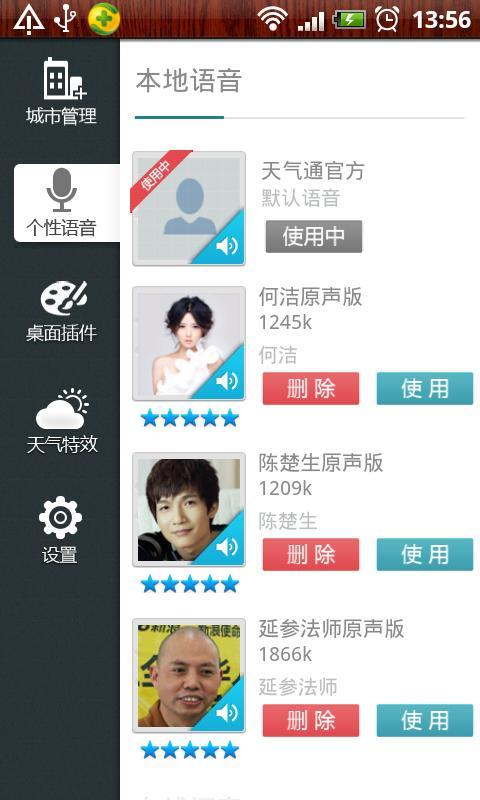 点击主界面右下角天气闹钟图标->选择播报语音->更多->下载明星语音->使用