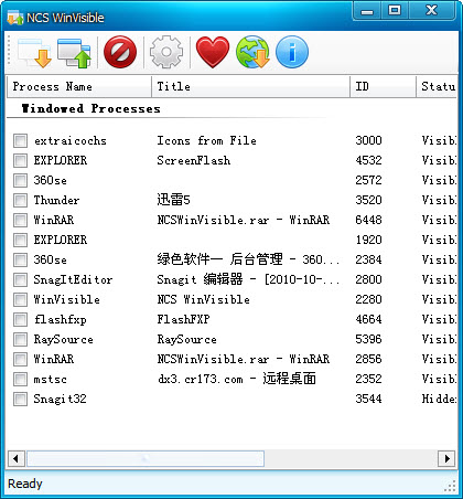 NCS WinVisible是一款小巧实用的隐藏运行程序工具。支持批量隐藏运行程序,用快捷键隐藏程序。运行 NCS WinVisible 后,会自动列出目前运行的程序,勾选你要隐藏的程序,可多选。然后按快捷键 Shift + Alt + H 来隐藏,Shift + Alt + S 来恢复。