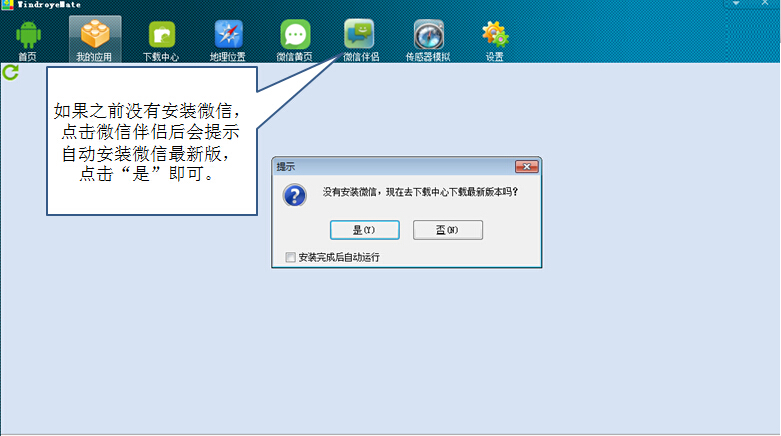 文卓爷安卓模拟器是一款能让你在电脑上运行安卓应用的安卓模拟器工具,为了用户使用更加方便,除集成了APP下载中心、GPS设置外,Windroye还提供了一些特色功能,如微信黄页、微信伴侣、传感器设置等。