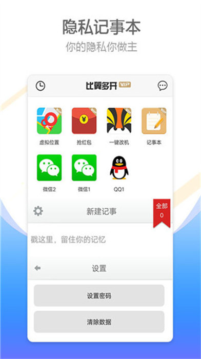 比翼多开2022最新版是超级好用的多开神器,轻松双开微信、qq、抖音等,支持32位和64位安卓系统,最新版适配安卓10了,无需root刷机就能轻松分身多开,功能强大,安全绿色无毒,支持海量应用和游戏。
