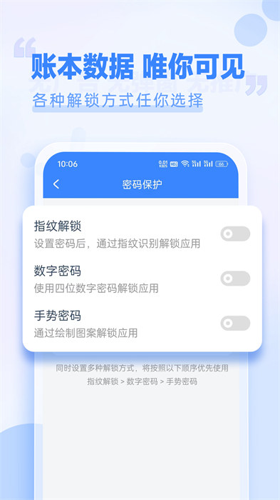 【密码保护】指纹解锁、数字密码、手势密码,随便你设置,足够安全。