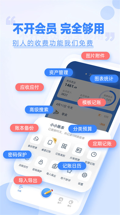 没有各大老牌记账软件的繁杂,没有任何广告,没有投资理财电商页面,没有任何权限申请,没有后台耗电服务,无需购买付费会员/VIP即可使用所有功能。