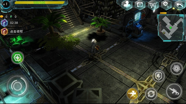 游戏在屏幕的左下方设置虚拟摇杆来控制人物的行动,在右下方有四个固定按键分别为射击键、切换弹夹键、免疫键、特色装备键和高电压炸弹键。射击键是最重要的攻击按键,切换弹夹键可以更换武器子弹弹夹,免疫按键可以在四秒内免疫异形攻击,高压炸弹键可以炸晕附近所有丧尸,这些辅助技能都是无限的,只需要一定的时间来恢复能量就可以,最后一个特色装备键则是有次数限制的,当然可以在商城里面购买特殊武器。其中是个辅助键都围绕着射击键,这让玩家操作起来非常方便,整个按键的排列又复合人体工程学,让玩家在玩的时候会感觉十分自然。