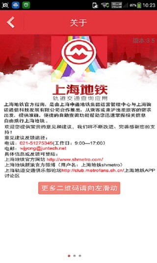 上海地铁电子指南在“更多内容”版块内设置了乘客须知和公共交通卡地铁退卡网点信息介绍。同时,还提供上海地铁网络服务与监督热线(64370000可实现软件直接拨号功能)、上海地铁官方网站、官方微博、上海地铁志愿者报名、上海轨道交通俱乐部等实用信息链接,方便乘客查找使用上海地铁的相关信息服务。