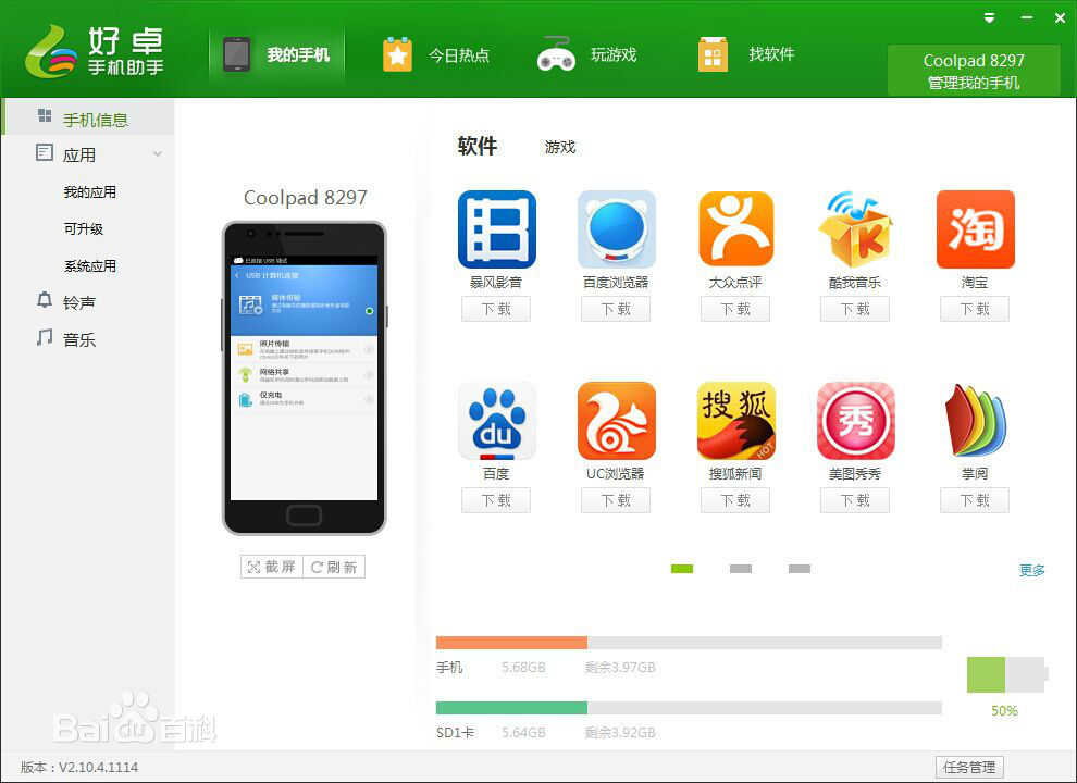 链接成功后你就可以在我的手机页面中管理自己手机的已安装应用及手机内存中的文件,你也可以在玩游戏与找软件中的海量内容中找到自己想要的安卓应用软件游戏。