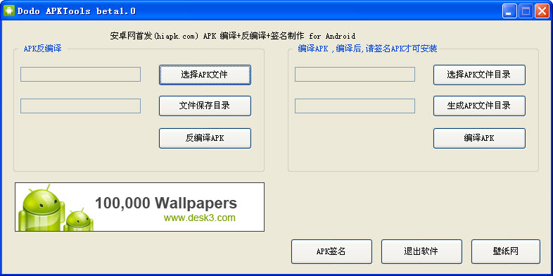 老外写的《android-apktool》软件,可以帮助我们把APK反编译,生成程序的源代码和图片、XML配置、语言资源等文件。我们对图片和语言资源等文件修改后,可以再把它们编译打包成APK