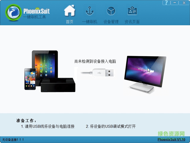1.在绿色资源网下载并安装安卓刷机工具软件:PhoenixSuitPacket,安装后打开软件界面