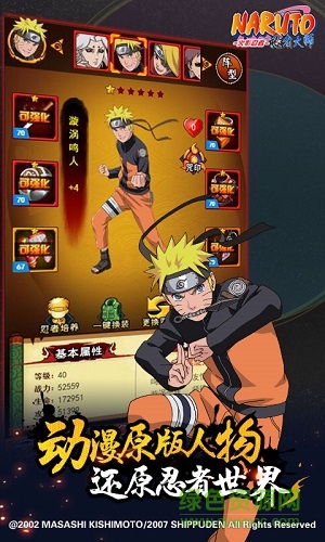 继承火之意志,重燃火影之梦!“火影忍者”正版授权手游《火影忍者-忍者大师》火爆震撼来袭!游戏极致还原动漫剧情,完美保留原著画风,为全国忍者迷们再启忍者世界;众多熟悉的卡牌角色悉数登场,招募高级忍者一同作战;究极忍术由你操控,引爆战斗高潮;血统感情激发种种羁绊,探索忍者世界的真正奥秘;打造最纯正的“火影忍者”手游。忍者大师之路,让我们一起并肩成长。