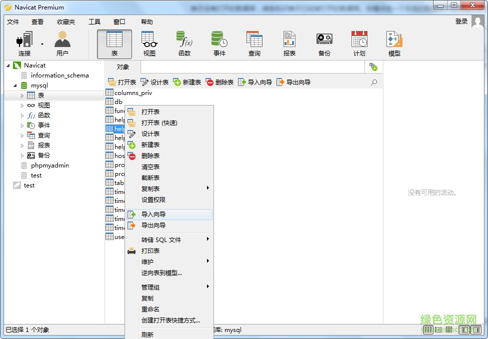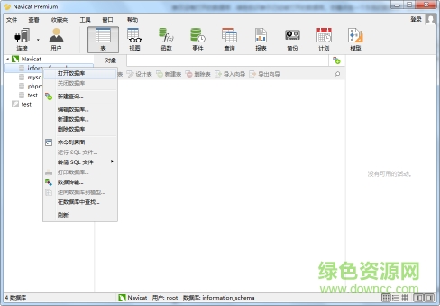 Navicat 同样支持SSL或SSH连接,连接成功后,在左侧的导航窗口后会看到本机所有的MySQL数据库,其中灰色标识表示没有打开的数据库,绿色标识表示已经被打开的数据库。右键点击一个灰色的数据库,在右键菜单中包含打开、关闭、新建、删除和数据传输、管理用户等命令。