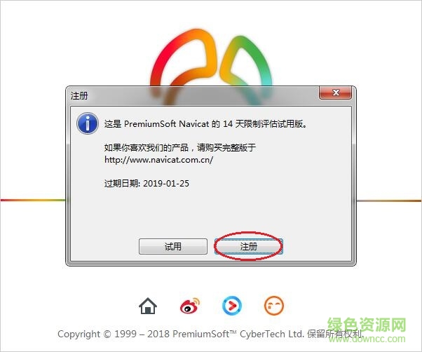 5.打开navicat premium 12,会有一个试用的提示,点击“注册”按钮(也可以进入主界面后,点击菜单栏的“帮助”,选择“注册”)