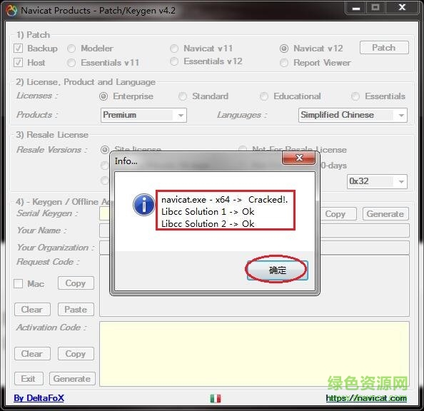 3.自动会有一个“navicat.exe - x64 -> Cracked!.”的弹窗提示,点击“确定”