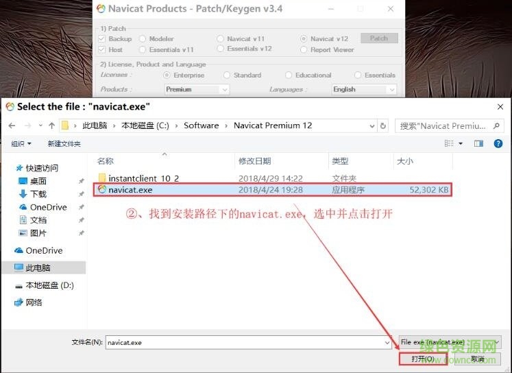 如果说没有自动弹出,需要选择文件的话,找到Navicat Premium 12安装路径下的navicat.exe,选中并点击打开,就会有上图的提示。
