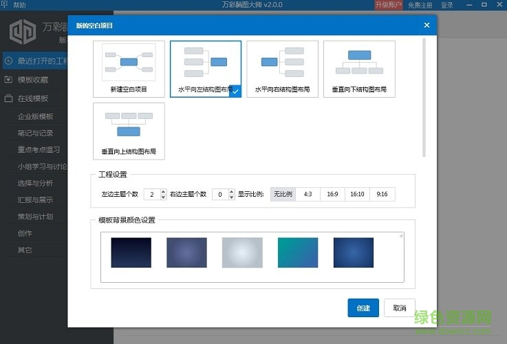 选择你需要的结构布局,设置上方和下方或者左边和右边的主题个数,显示比例和背景颜色,点击“创建”即可