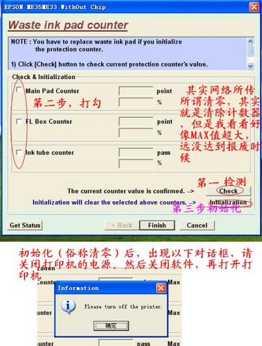 4、到了这一步,直接点击check检查一下打印机计数器,然后将标记的这三个选项打勾,再选择check下面的初始化按钮,就是那个比较长的英文按钮