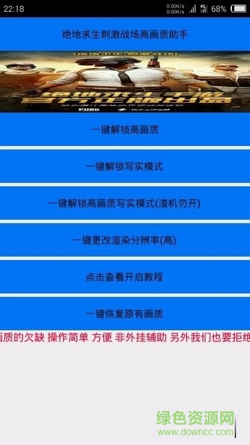 绝地求生刺激战场高画质助手是能够提高绝地求生刺激战场游戏画质的软件,高清晰度的游戏画面不仅仅能提升你的游戏体验,同时还能方便你尽快的观察到身边的敌人,保护自身的安全,需要的用户快来绿色资源网下载吧!