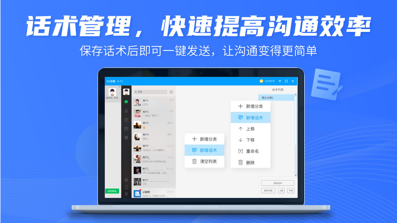 EV多聊是一个简单实用的微信多开软件。不仅可以快速登录多个微信,还能够帮助用户实现高效的客户管理。常用的高频词话术可以添加分类、分组保存、随时编辑、一键发送。