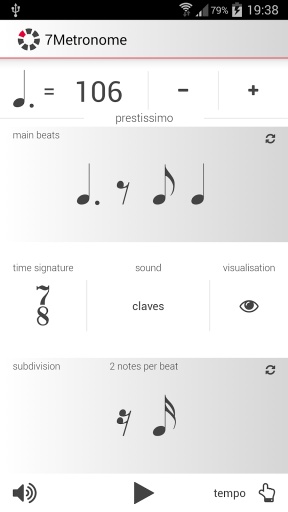 7Metronome可能是Android设备中最通用的免费节拍器应用程序。直观的多点触摸用户界面使节拍器变得非常简单和有趣。通过触摸,拖动,捏或缩放建立复杂的节奏。有一些棘手的节奏,或想提高你的时间?这个节拍器将在任何情况下支持你。