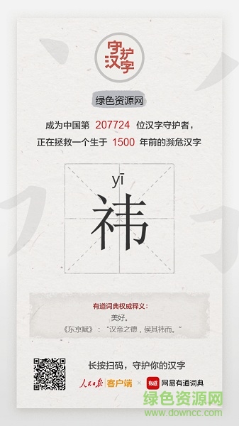 以你之名,守护汉字活动是有道词典携手人民日共同开启的一个守护文字的活动,这个活动的意义就是守护我们国家最伟大的传统文化遗产文字。打开测试页面,填上你的名字后你就会成为某一个文字的守护者。这个字和你也是非常有缘分的,大家可以在以后的日子中使用这个文字成为自己的标志。下图中有守护汉字二维码哦,大家可直接扫描关注使用。