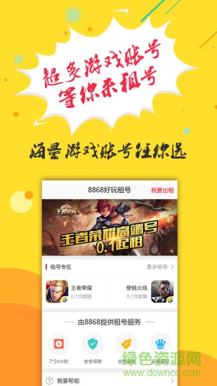 8868租号手游交易平台是一款专门为广大的手游玩家提供租号功能的软件,软件内收纳了众多游戏大神账号,让玩家轻松即可享受到高手战场带来的刺激体验,更多精彩等你来玩,喜欢的用户快来绿色资源网下载吧!