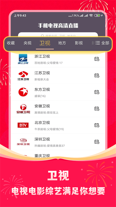 全国所有省份重点频道,浙江卫视、东方卫视、江苏卫视、北京卫视等,乘风破浪的姐姐、中国好声音、青春环游记、舞者、王牌对王牌、从地球出发、欢乐喜剧人、新声请指教、中国达人秀、做家务的男人、劲爆电影电视剧,影视直播大全,以家人之名、三十而已、爱之初、局中人、小娘惹、三叉戟、如果岁月可回头、安家、我在北京等你、精英律师、都挺好、情感相亲、生活美食、明星热点、音乐盛典栏目等等全部囊括其中,只需轻松一点,央视电视直播节目随时看。