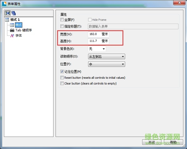 2、将“宽度”和/或“高度”文本框中的值修改为所需的值即可,在此属性页中,你还可以进行其他设置操作,如为表单设置“背景色”、“全屏”显示等等,设置完成后,单击“关闭”即可。