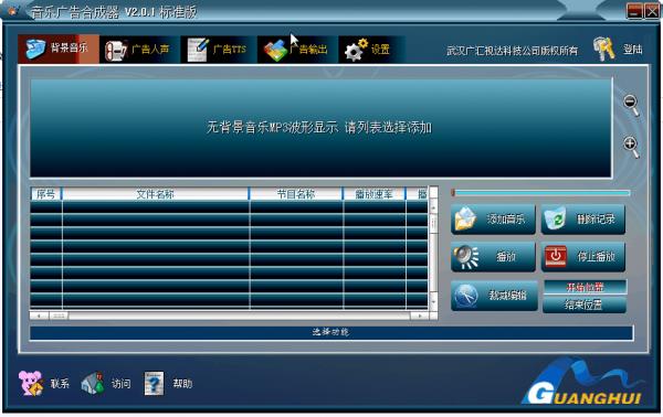 音乐广告合成器是一款功能实用的广告音乐合成制作工具,非常简单的操作就可以把广告人声快速合成音频文件,也可以把文字转换成语音,再跟背景音乐合成,利于进行推广宣传,同时提供人声音效调整及裁减、背景音乐裁减等功能。集成广汇视达音效器及音频转换器,可实现任意MP3转换及多种音乐效果处理;同时支持VBR、CBR、ABR等多种 MP3编解码;支持波形、频谱显示等功能,给你一个更好的广告效果。