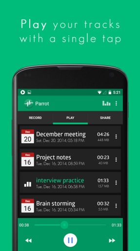 声音录制Parrot是一个免费的声音录制应用并可以让你录制、播放并分享声音,并只需三步即可!简洁美观的用户界面将会让你轻松的录制声音。 声音录制Parrot是完全免费,没有时间功能限制并没有广告的应用!